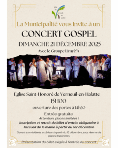 La Municipalité de Verneuil-en-Halatte a le plaisir d’inviter les Vernoliens à un concert gospel unique, avec le talentueux Groupe Limyè’A ! 📅 Dimanche 21 décembre 2025 🕒 15h00 (Ouverture des portes à 14h30) 📍 Église Saint-Honoré ✨ Entrée gratuite – sur inscription 🔖 Pour accueillir chacun dans les meilleures conditions et conserver l’esprit local de cette manifestation, un billet d’entrée sera demandé. Vous pourrez le retirer à l’accueil de la mairie à partir