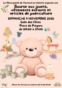 La Municipalité de Verneuil-en-Halatte organise une bourse aux jouets, vêtements enfants et articles de puériculture le dimanche 9 novembre 2025, de 10h00 à 17h00, à